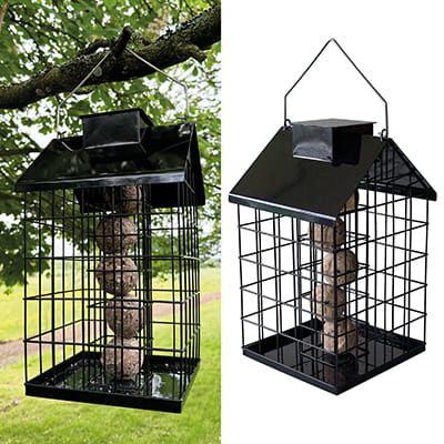 Udstyret med værn mod større fugle, så småfuglene kan nyde maden i fred og ro.