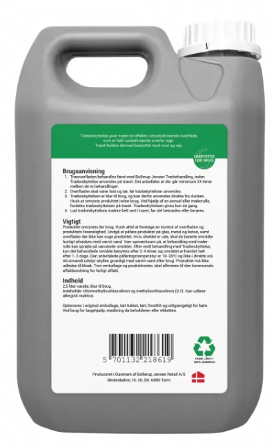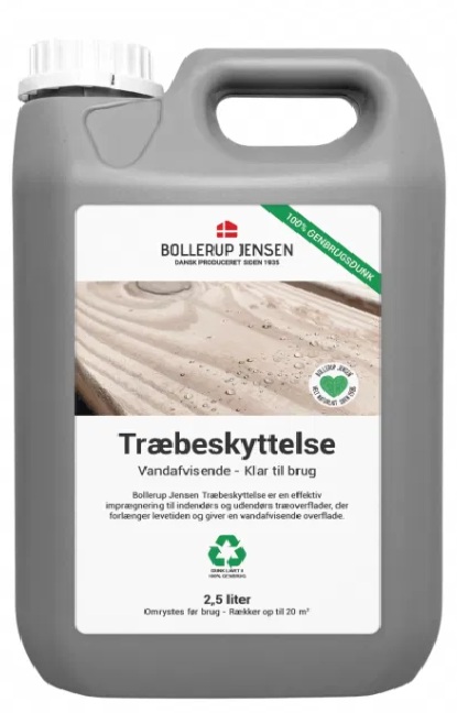 - Træoverfladen behandles først med Bollerup Jensen Træbehandling, inden Træbeskyttelse anvendes på træet. Det anbefales at der går minimum 24 timer mellem de to behandlinger.