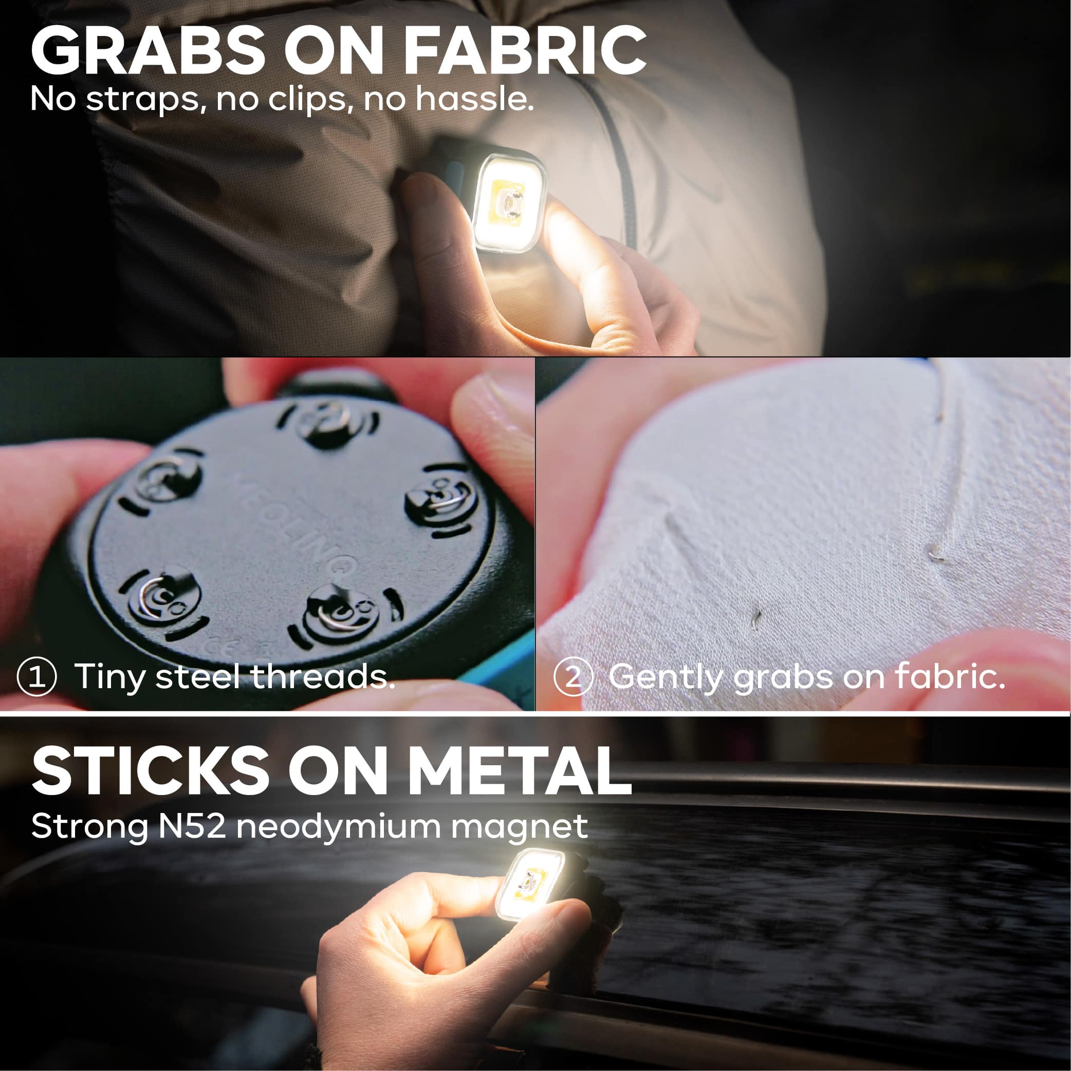 Meolinq Lys 01 er en smart og alsidig lygte på 500 lumen, som nemt sættes fast på tøj eller udstyr – helt uden stropper og klips. Den kan også hæfte magnetisk på metal. Med trinløs dæmpning, lang batteritid og vandafvisende design er den ideel til ridning, hundeture, cykling, camping og meget mere.
