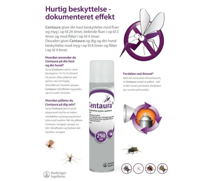 | Centaura® giver en langvarig og effektiv afvisende virkning mod insekter. Beskytter straks efter anvendelse. Beskytter mennesker mod myg i op til 8 timer, fluer i op til 5 timer og mindsker risikoen for bid af skovflåter i op til 4 timer. Beskytter heste mod myg og fluer i op til 24 timer og mindsker risikoen for bid af skovflåter i op til 4 timer. Beskytter straks efter anvendelse. Indhold: 250 ml. Centaura har lavet denne insektspray, der anvendes som afskræknings middel mod stikkende og bidende insekter. Insektspray til afskrækkelse af stikkende insekter Er velegnet til myg, fluer, kvægfluer og hestebremser Kan også anvendes til flåter Klassificeret som: Produktet er biocid. Kompatibel med læder og tekstilmaterialer. Prøv ikke et synligt sted, inden du vil påføre produktet. Sprøjt ikke direkte på ansigtet. Undgå kontakt med læber, sår eller irriteret hud. Anvend ikke på hud, der er blevet forbrændt. Kontakt af produktet med mund og øjne bør undgås. Undgå indånding af insektsprayen. Må kun anvendes steder med god ventilation. Yderst brandfarlig. Beholderen er under tryk og kan derfor eksplodere ved opvarmning. Kan forårsage alvorlig øjenirritation. Opbevares utilgængeligt for børn. Sådan anvender du Centaura Insektspray Spray med en afstand på 10-15 cm fra kroppen. Distribuer forsigtigt produktet med en fejende håndbevægelse. Spray indtil huden eller pelsen er let fugtig. Selv under maven på hesten, da flasken kan anvendes på hovedet. Ansigt, hoved og hals behandles med en lille mængde, der først sprøjtes i håndfladen og derefter fordeles jævnt. Vask hænderne efter brug. |